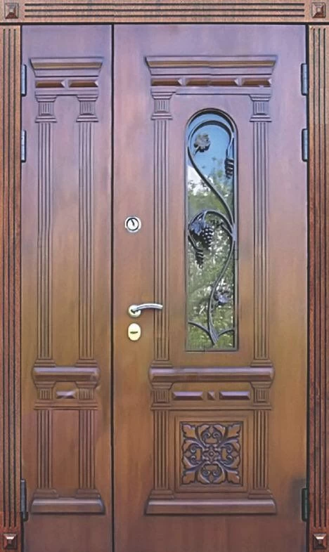 Часто декорирование дверей ковкой используют вместе со стеклом, отделывают витражным узором, используют зеркальные вставки. Стекло в этом случае применяется антивандальное, с трудом поддающееся разрушению.