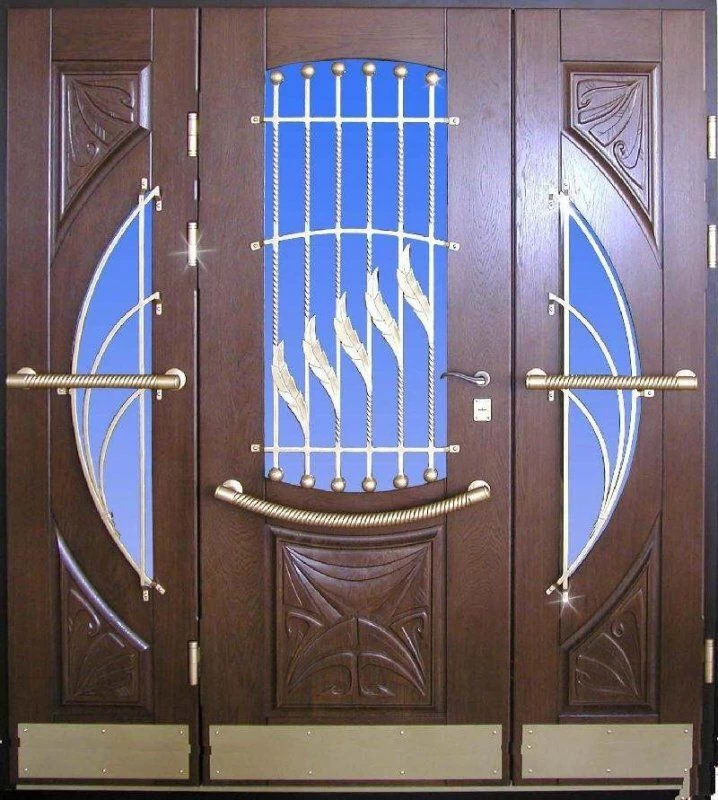 Часто декорирование дверей ковкой используют вместе со стеклом, отделывают витражным узором, используют зеркальные вставки. Стекло в этом случае применяется антивандальное, с трудом поддающееся разрушению.